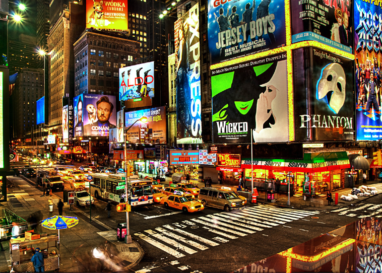 Enjoy the bright lights of Broadway and the electric Time Square, the luminous "Crossroads of the world” - using enough power to light up 1.6 million 100 watt light bulbs.